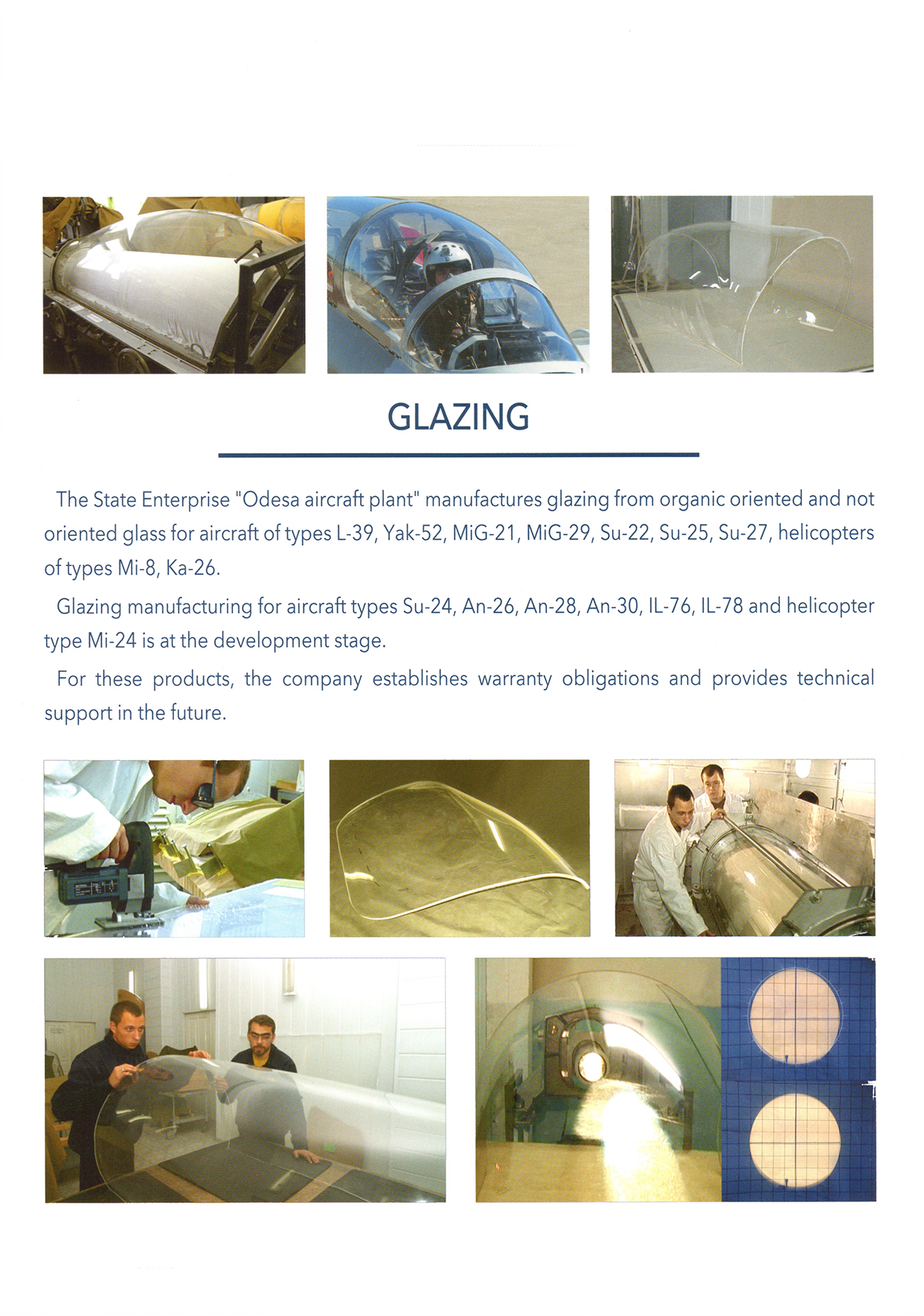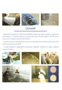Glazing production for planes MiG-21, MiG-23, MiG-29, Su-22 (Su-17), Su-24, Su-25, Su-27, L-39 and for helicopters Mi-8, Ka-26.