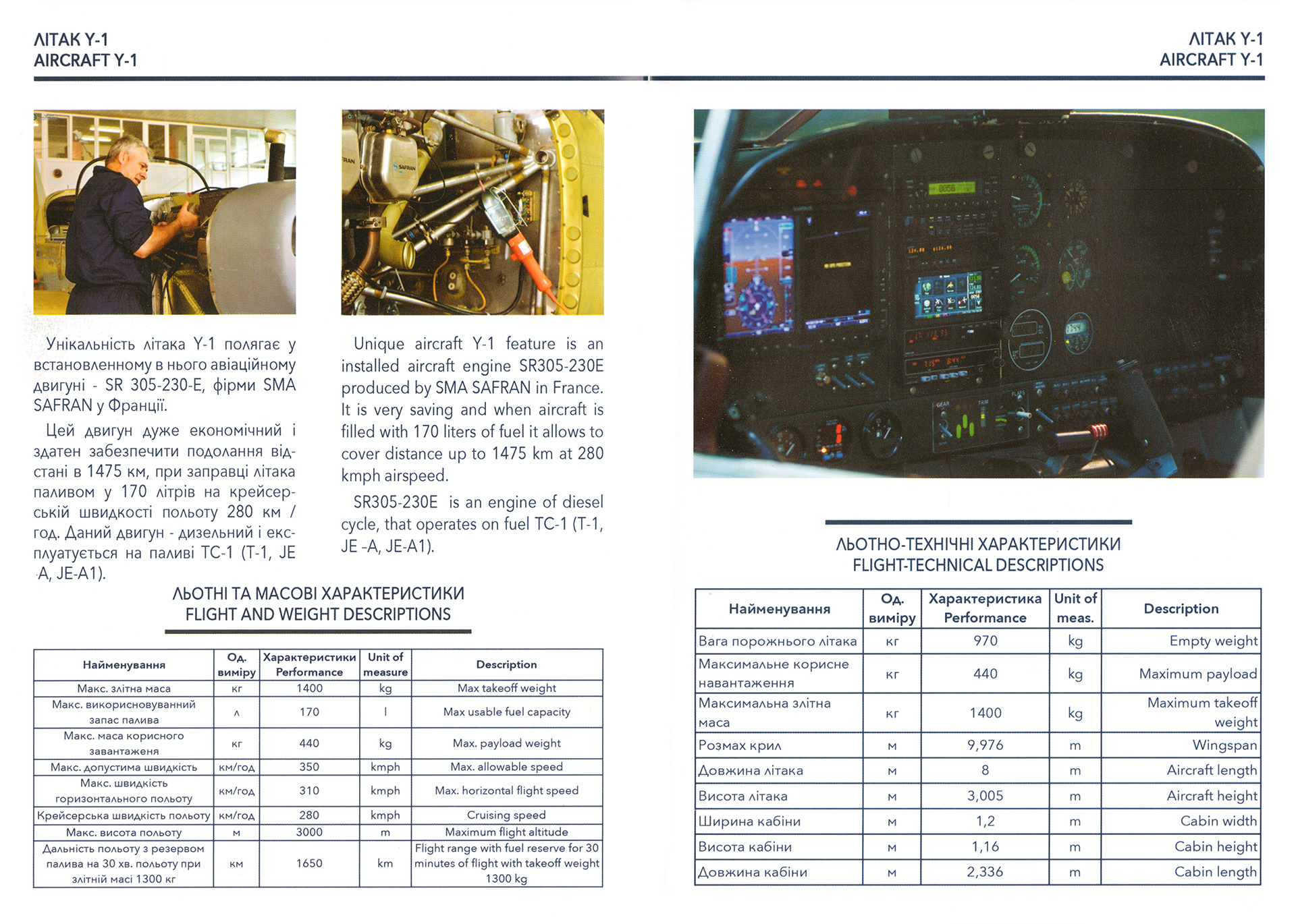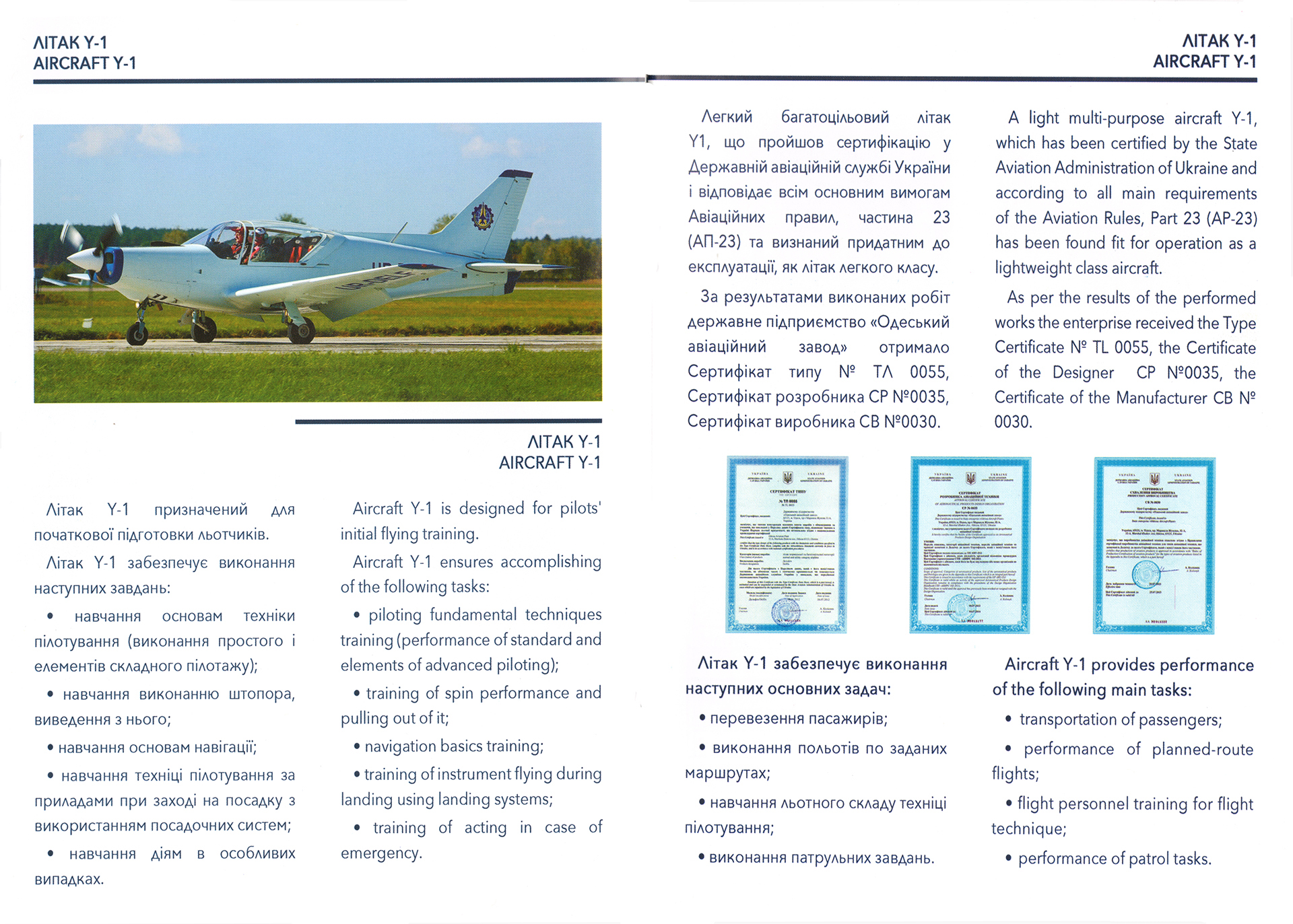 Літак типу Y1 пройшов сертифікацію в Державній авіаційній службі України і по всім основним вимогам Авіаційних правил, частина 23 (АП-23), визнаний придатним до експлуатації як літак легкого класу.