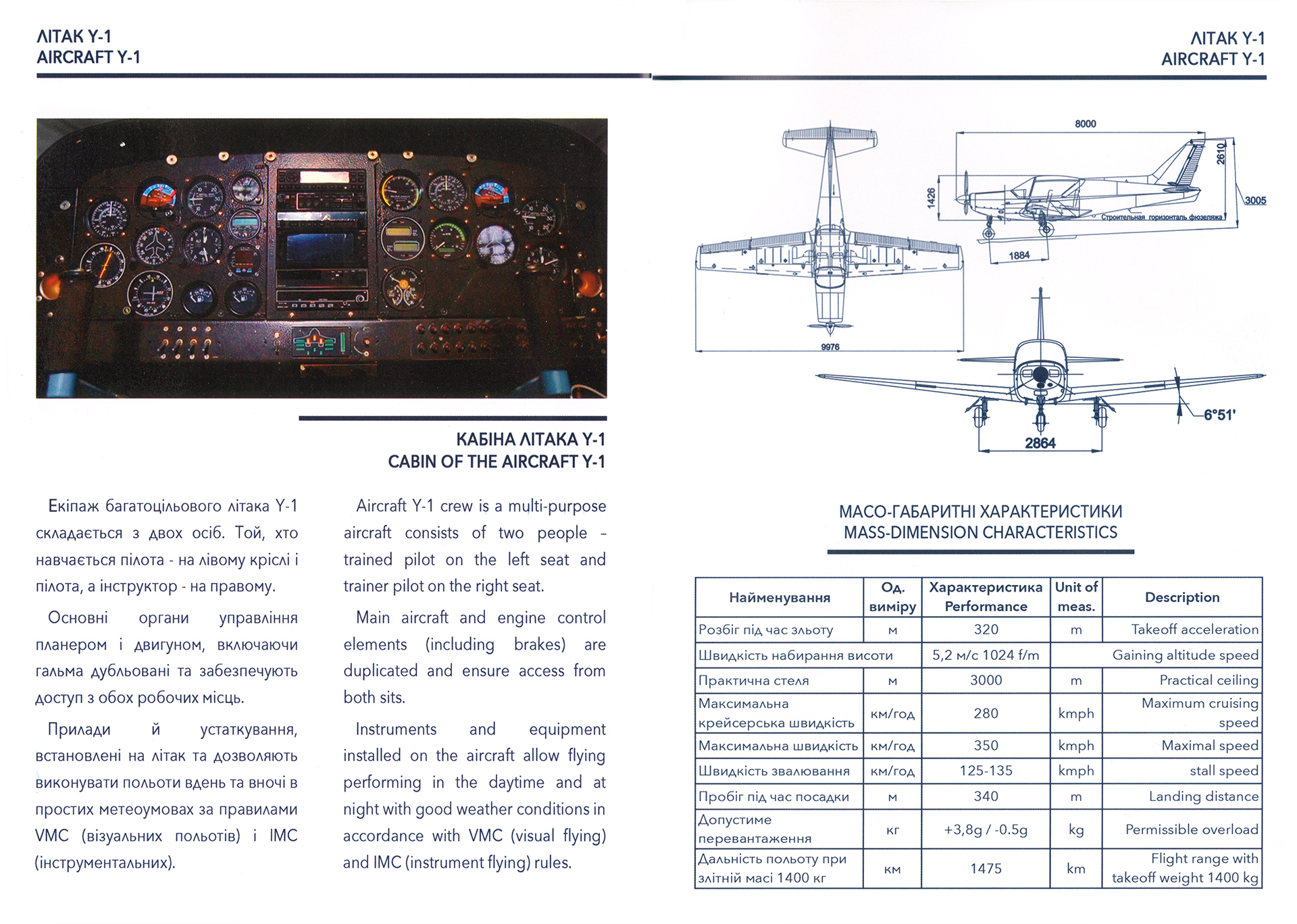 Легкий багатоцільовий літак типу Y1 є одномоторний класичний вільнонесучий суцільнометалевий моноплан з низькорозташованим крилом, горизонтальним і вертикальним оперенням, розташованим в хвостовій частині фюзеляжу, і трьохстійкове шасі, що забирається з керованою носовою стійкою.